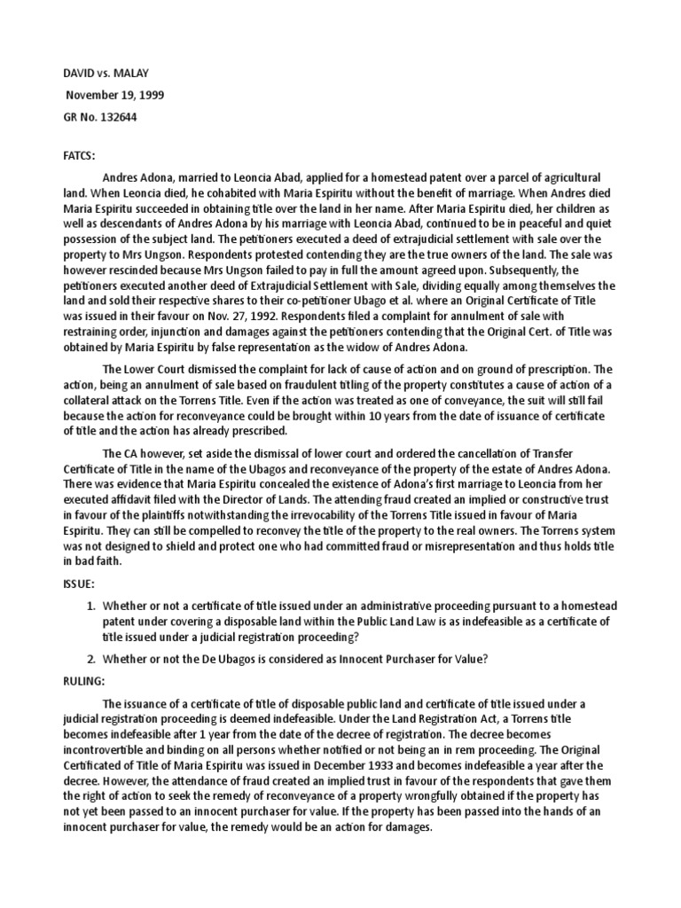 David Vs Malay Property Art 476 Conveyancing Deed