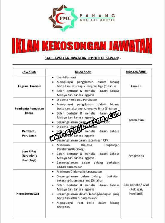 Jawatan Kosong Pahang Medical Centre Pmc 20 Ogos 2018 Appjawatan Malaysia
